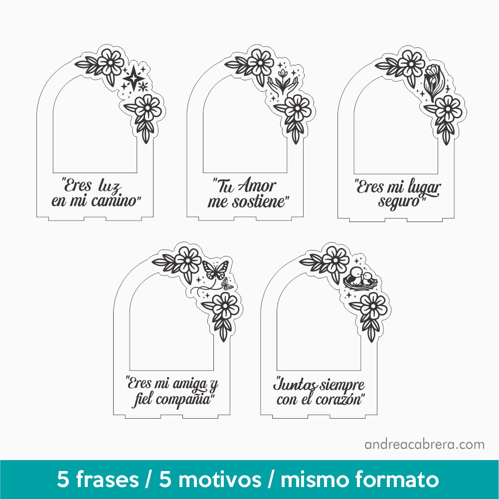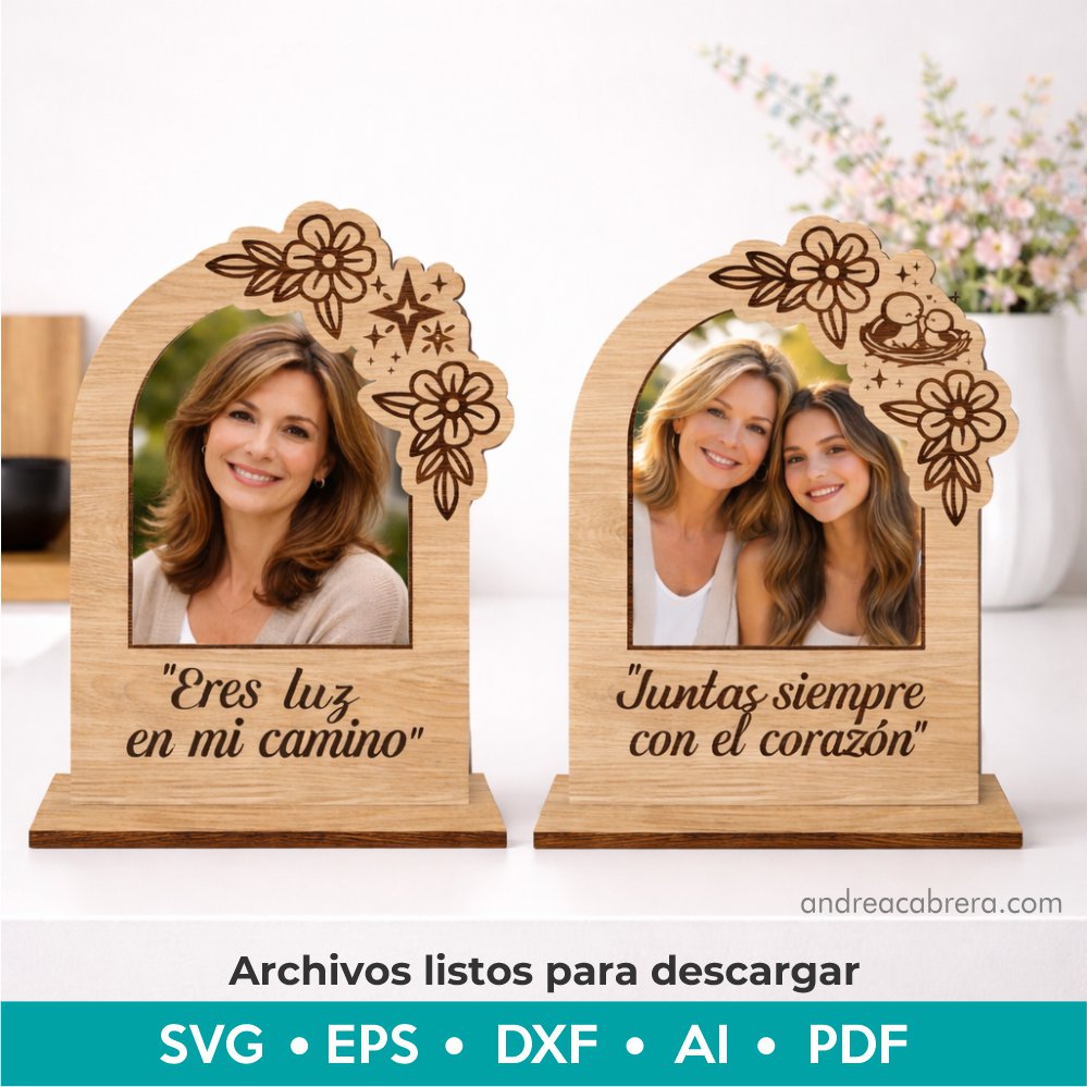 Este pack de 5 portarretratos Día de la Madre para corte láser incluye cinco diseños diferentes con el mismo formato base, pero con variación en la frase y en el motivo decorativo superior. Está pensado para producción en MDF de 3 mm, con un diseño funcional, limpio y listo para cortar y ensamblar.